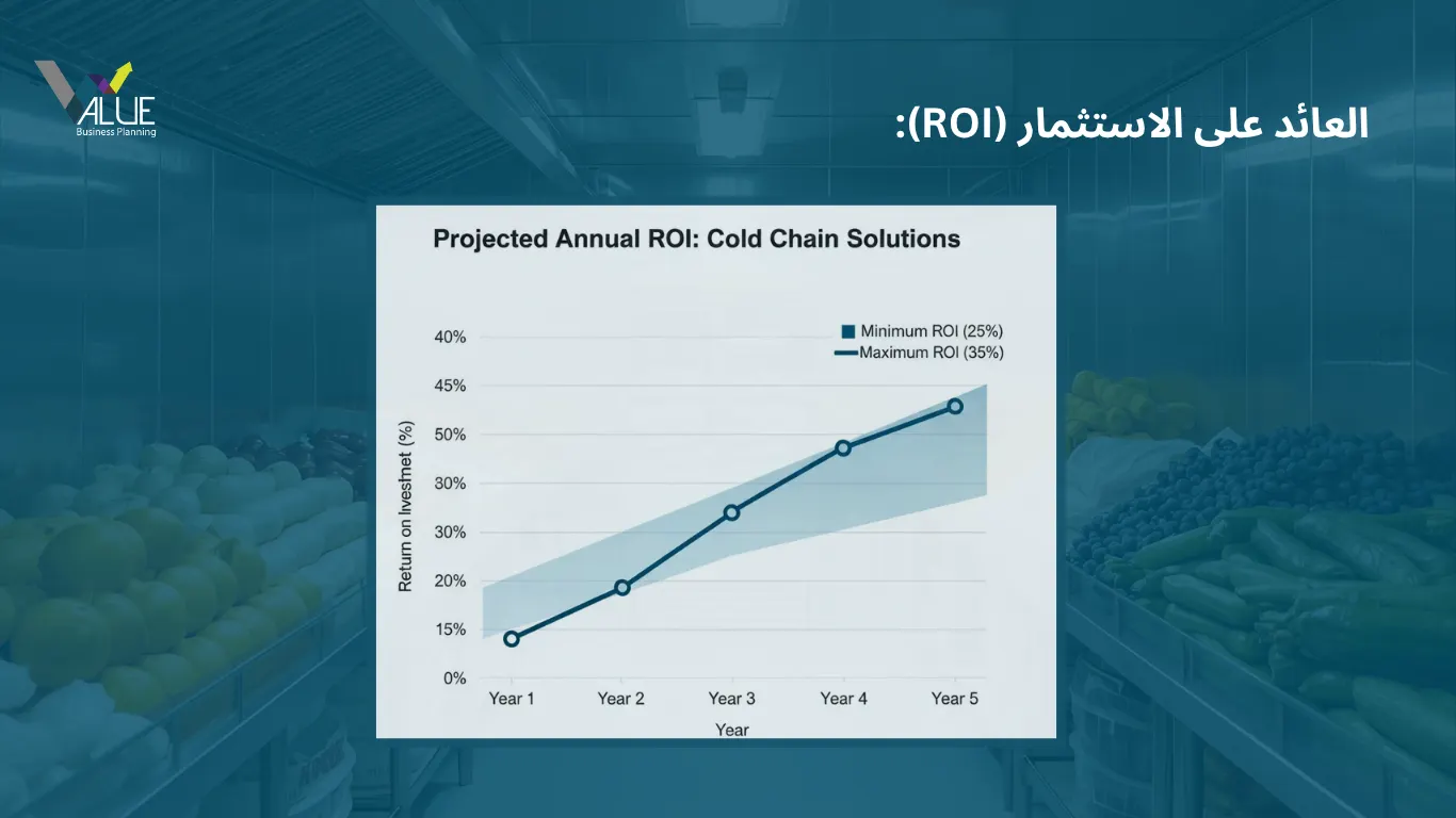 يعد مشروع ثلاجات التبريد والتجميد من المشاريع ذات العائد الاستثماري المرتفع نسبيًا، نظرًا للطلب المستمر من قطاعات الأغذية والأدوية والمطاعم. ومع الإدارة الجيدة وتطبيق أنظمة تبريد حديثة موفرة للطاقة، يمكن أن يتراوح معدل العائد الداخلي (ROI) بين 25% و35% سنويًا بعد فترة استقرار التشغيل.