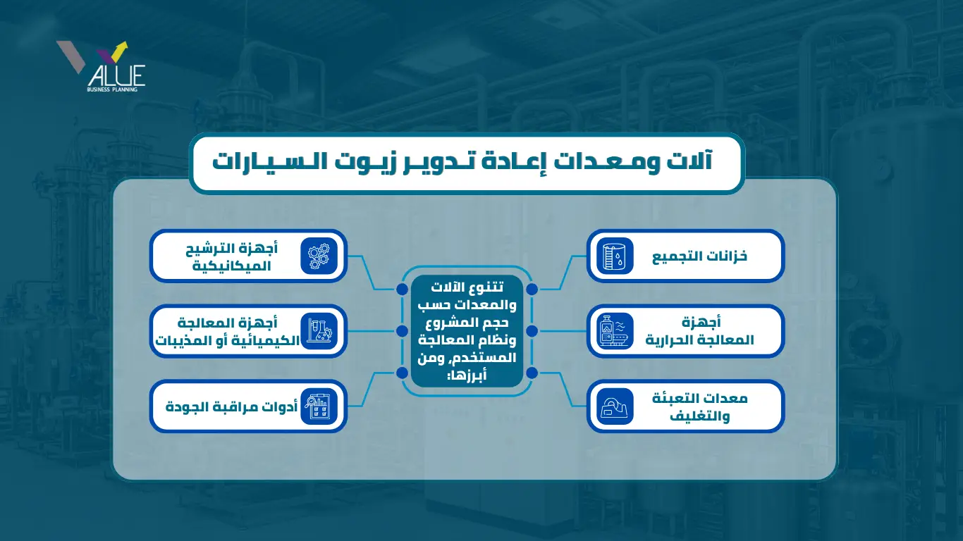 تهتم الخطة الفنية من دراسة جدوى مشروع إعادة تدوير زيوت السيارات باختيار المعدات والآلات المناسبة، التي تضمن كفاءة الإنتاج وجودة المنتجات النهائية.