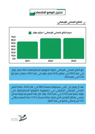 في دراسة جدوى جمعية خيرية بلغ الناتج المحلي الإجمالي لدولة الكونغو الديمقراطية 66,3 مليار دولار في عام 2023 في مقابل 65,8 مليار دولار في عام 2022 بمعدل نمو بلغ 7.8% في عام 2023.